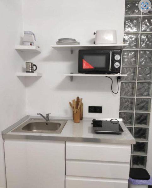 La cocina incluye fregadero,tetera,tostadora,microondas,cocina de un fogón sobrepuesta y freidora de aire y enchufes con conectores USB integrados.
