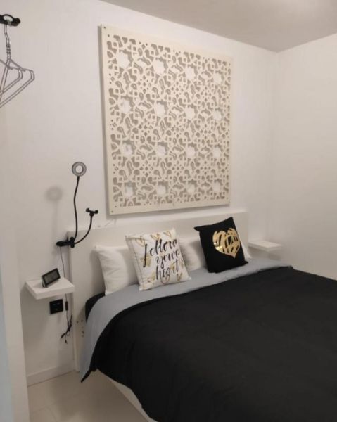 El dormitorio incluye cama grande de 1'60m con canapé,cabecero con guirnaldas de diseño de estrellas como luz cálida indirecta,lámpara de techo de luz cálida,luz de lectura con soporte para dispositivo móvil y,enchufes con conectores USB integrados,percheros y espejo de cuerpo entero con joyero.